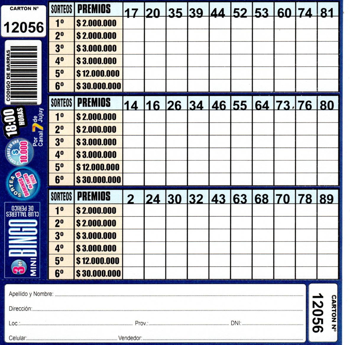 Comprá este cartón del 3er. MINI Bingo del Club Talleres de Perico con los números de tu suerte!!!