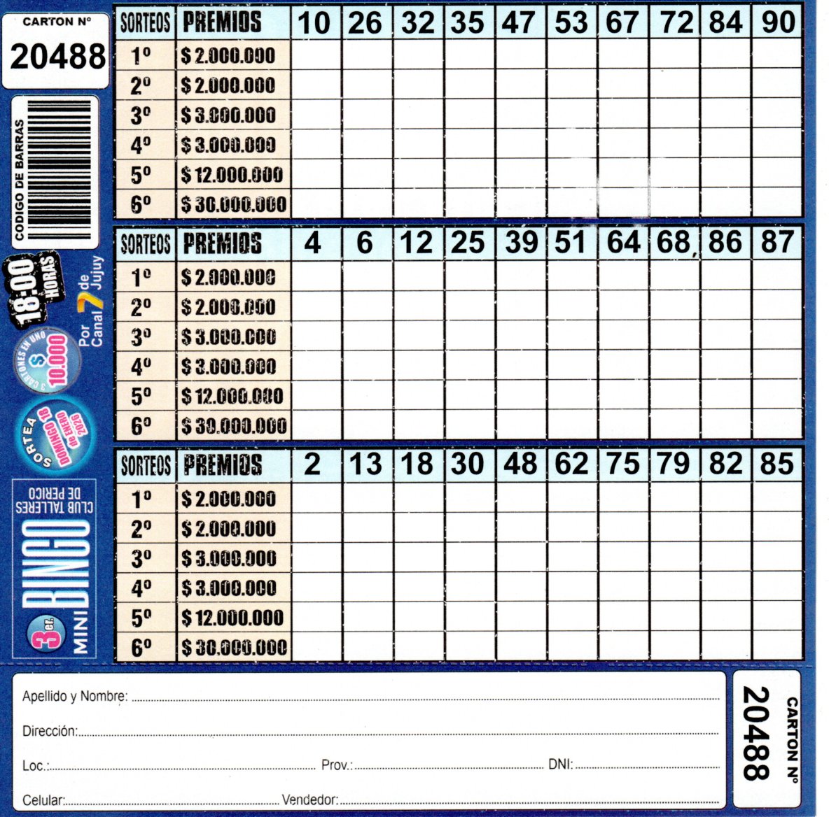 Comprá este cartón del 3er. MINI Bingo del Club Talleres de Perico con los números de tu suerte!!!