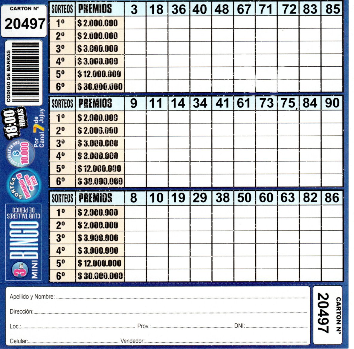 Comprá este cartón del 3er. MINI Bingo del Club Talleres de Perico con los números de tu suerte!!!