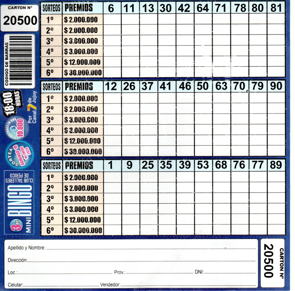 Comprá este cartón del 3er. MINI Bingo del Club Talleres de Perico con los números de tu suerte!!!