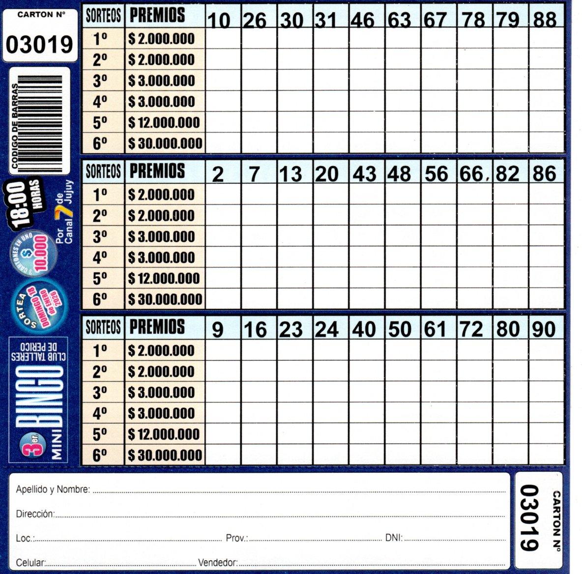 Comprá este cartón del 3er. MINI Bingo del Club Talleres de Perico con los números de tu suerte!!!