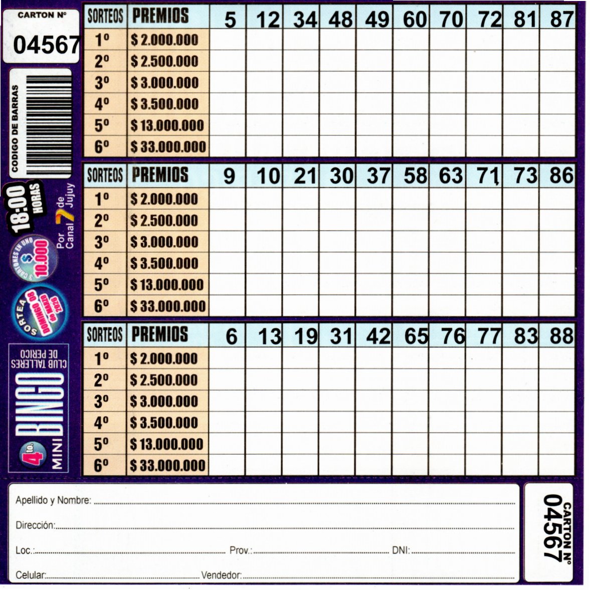 Comprá este cartón del 4to. MINI Bingo del Club Talleres de Perico con los números de tu suerte!!!