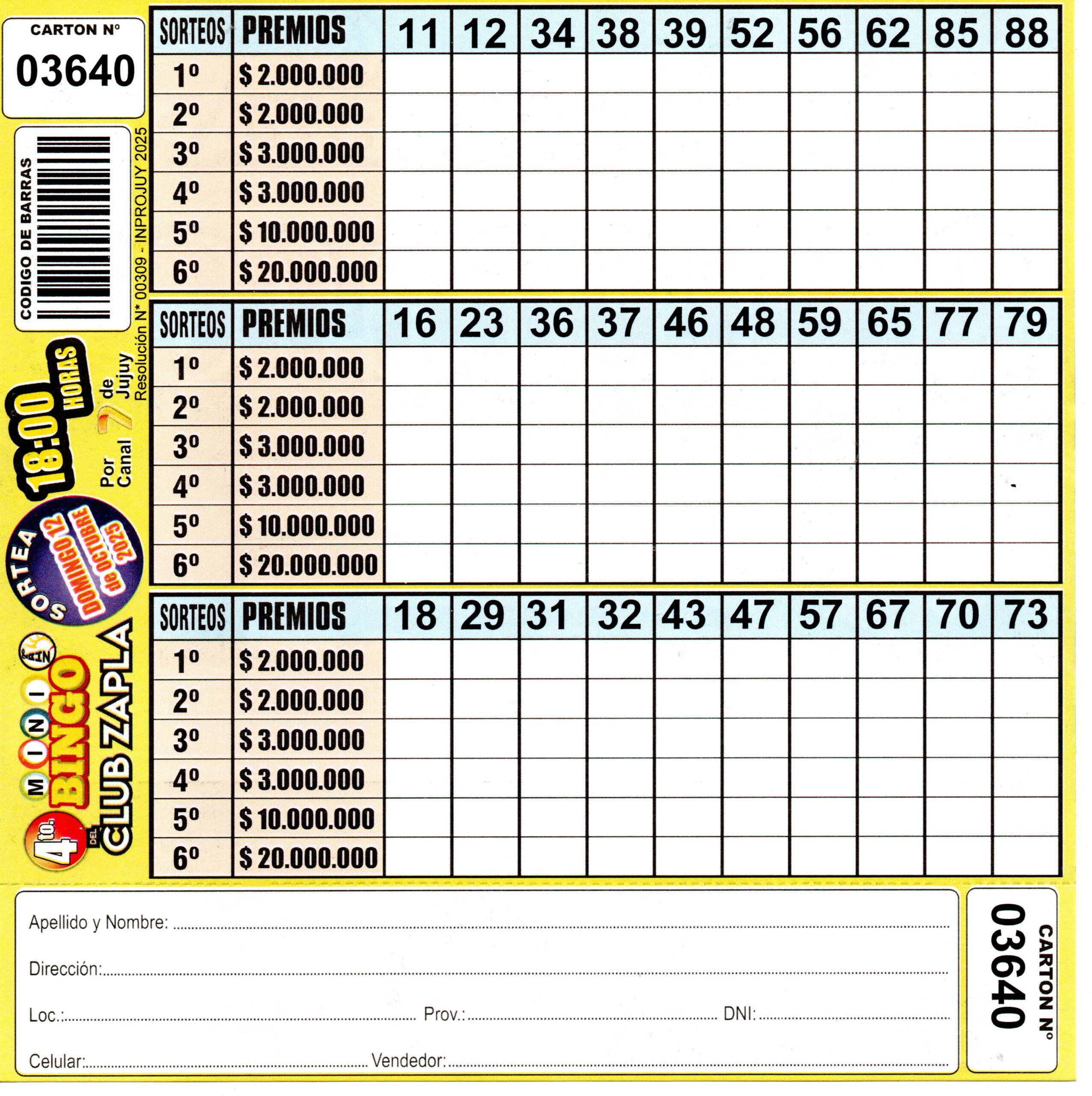 Comprá este cartón del 4to. MINI Bingo del Club Altos Hornos Zapla con los números de tu suerte!!!