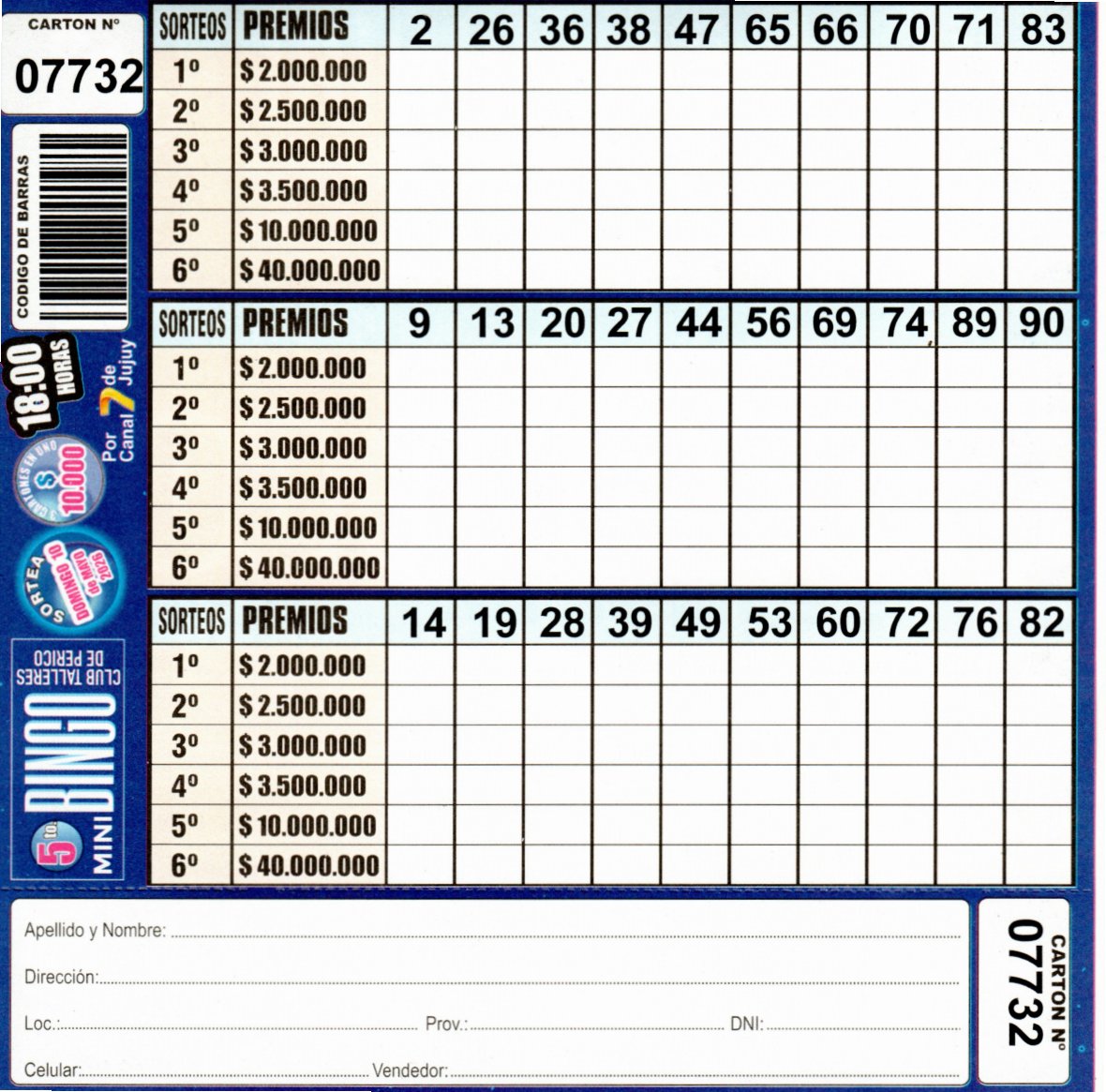 Comprá este cartón del 5to. MINI Bingo del Club TALLERES DE PERICO con los números de tu suerte!!!