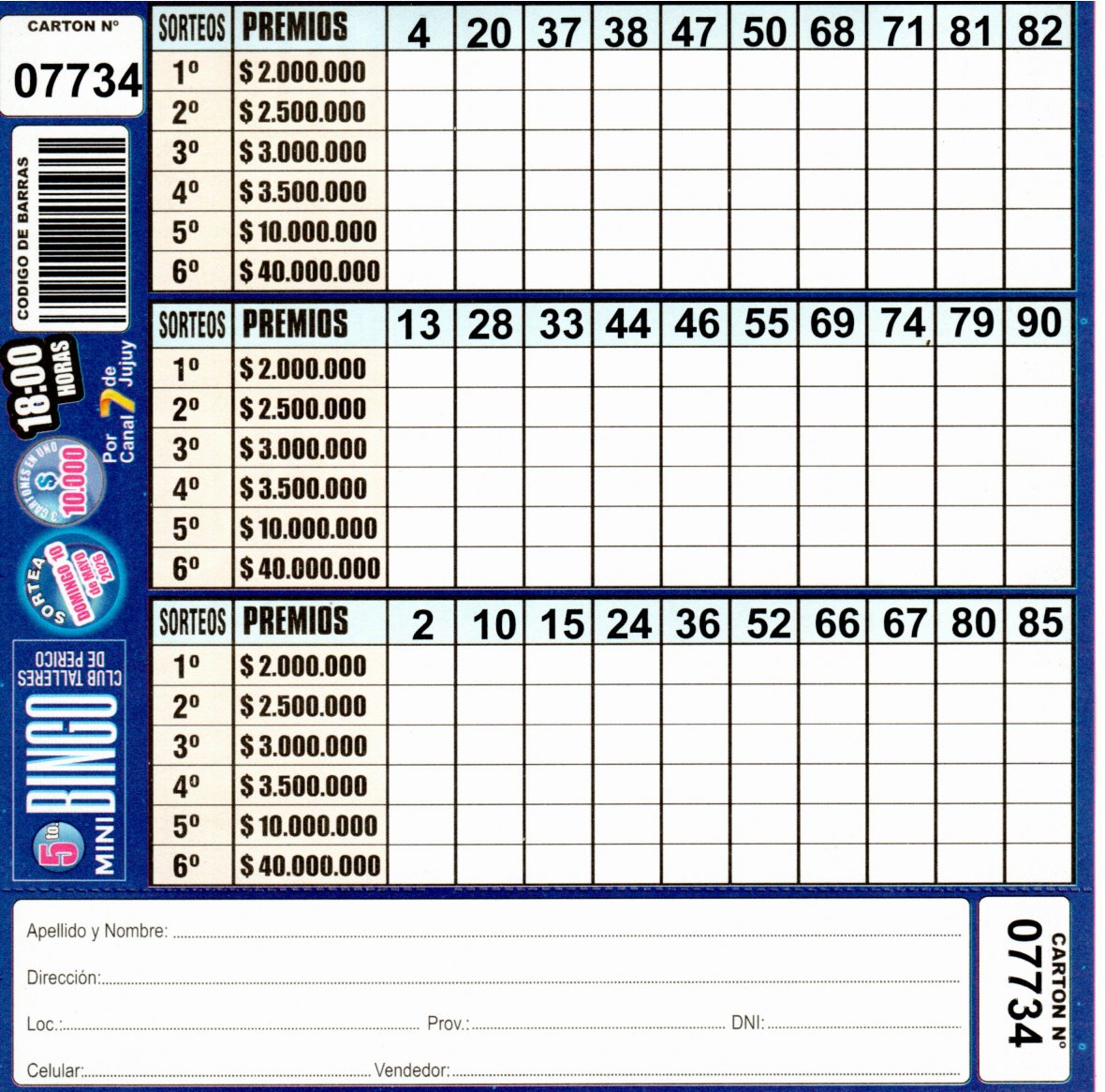 Comprá este cartón del 5to. MINI Bingo del Club TALLERES DE PERICO con los números de tu suerte!!!