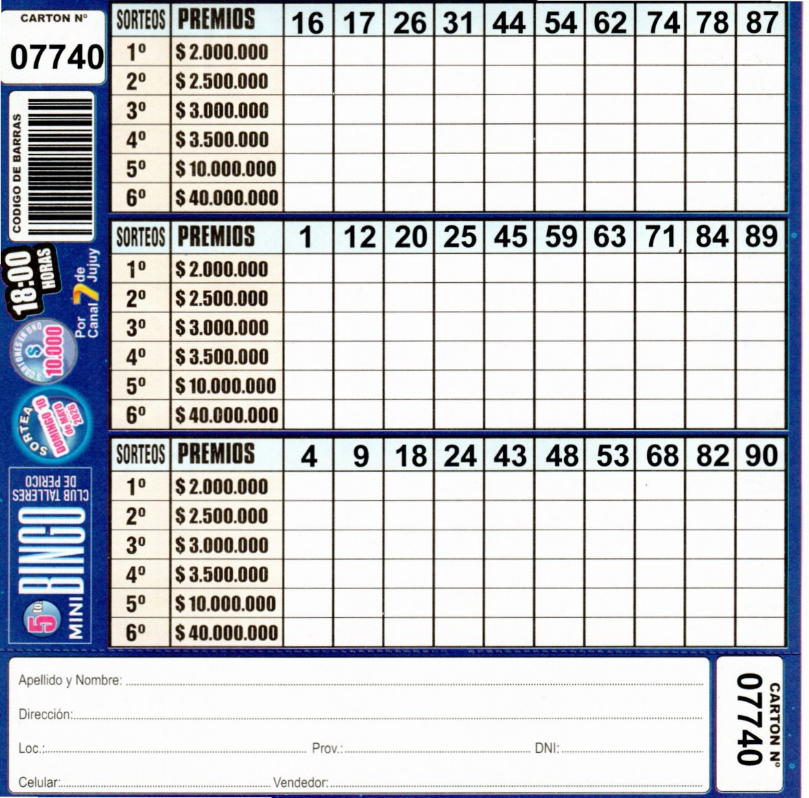 Comprá este cartón del 5to. MINI Bingo del Club TALLERES DE PERICO con los números de tu suerte!!!