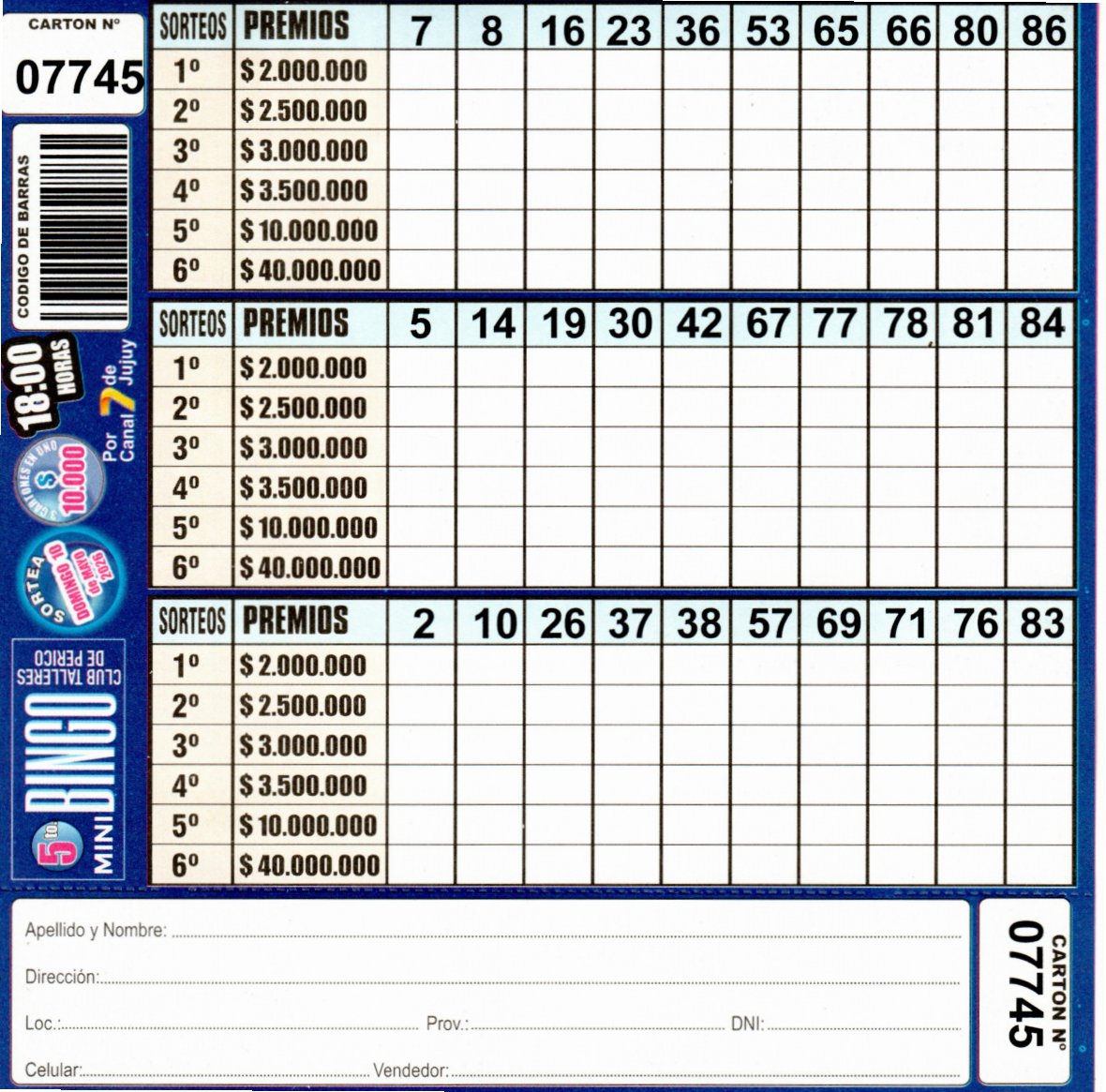 Comprá este cartón del 5to. MINI Bingo del Club TALLERES DE PERICO con los números de tu suerte!!!