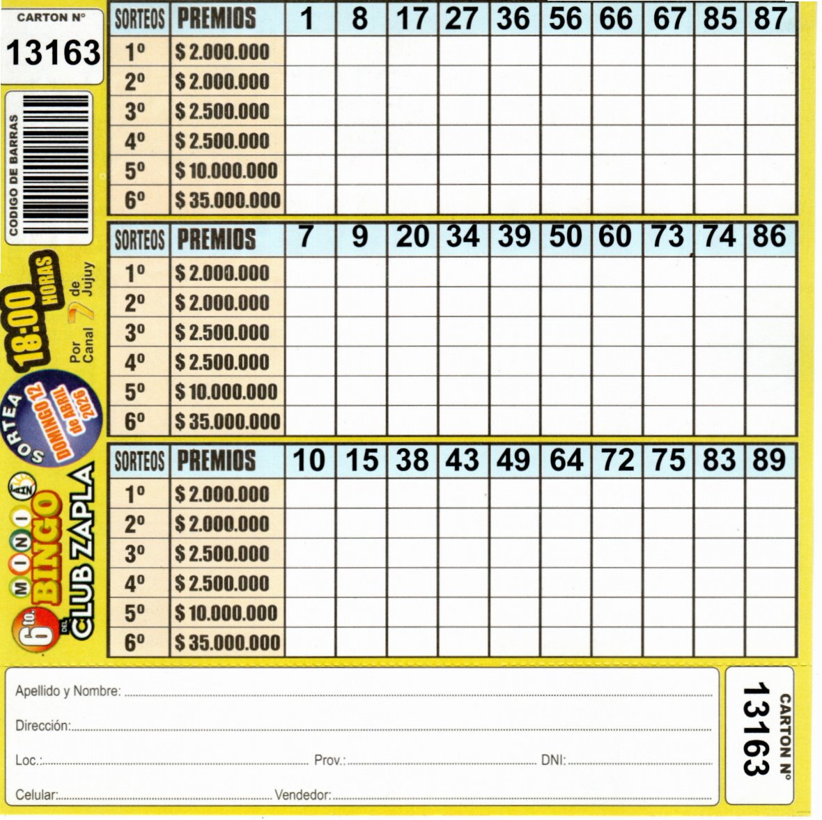 Comprá este cartón del 6to. MINI Bingo del Club Altos Hornos Zapla con los números de tu suerte!!!