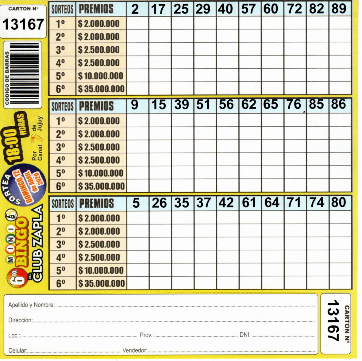 Comprá este cartón del 6to. MINI Bingo del Club Altos Hornos Zapla con los números de tu suerte!!!