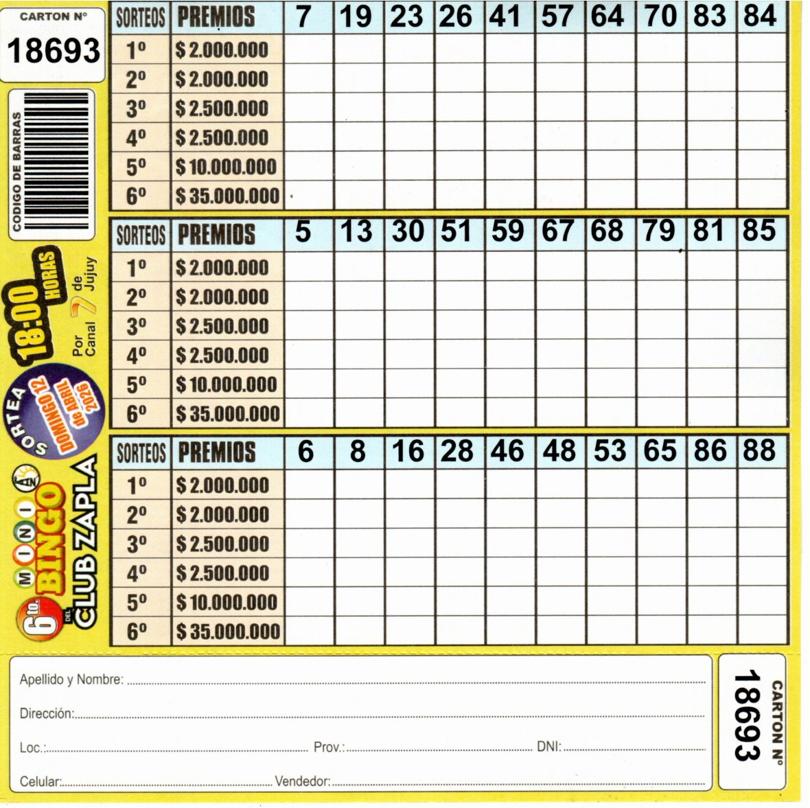 Comprá este cartón del 6to. MINI Bingo del Club Altos Hornos Zapla con los números de tu suerte!!!